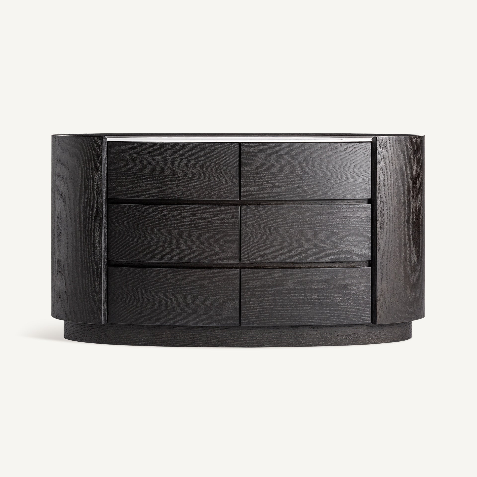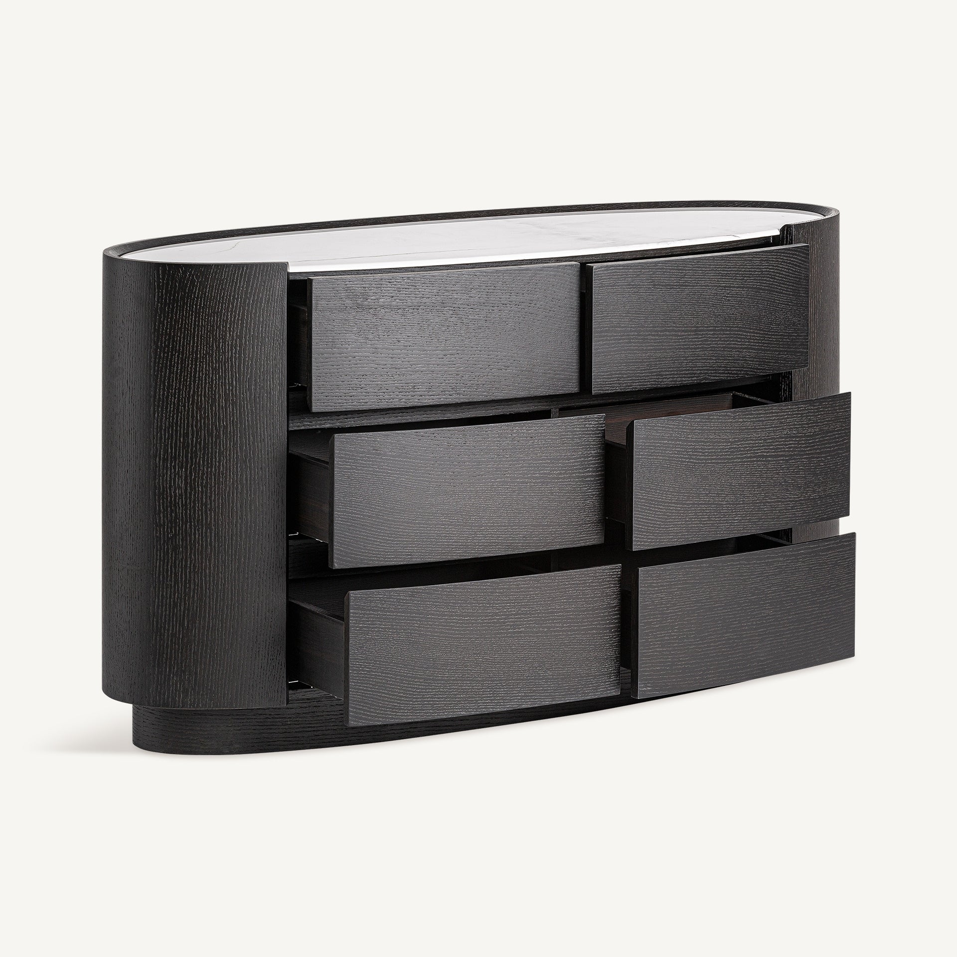 Elaborada en madera contrachapada negra y piedra sinterizada blanca, destaca por su contraste visual y diseño contemporáneo. Aporta carácter y funcionalidad a cualquier dormitorio.